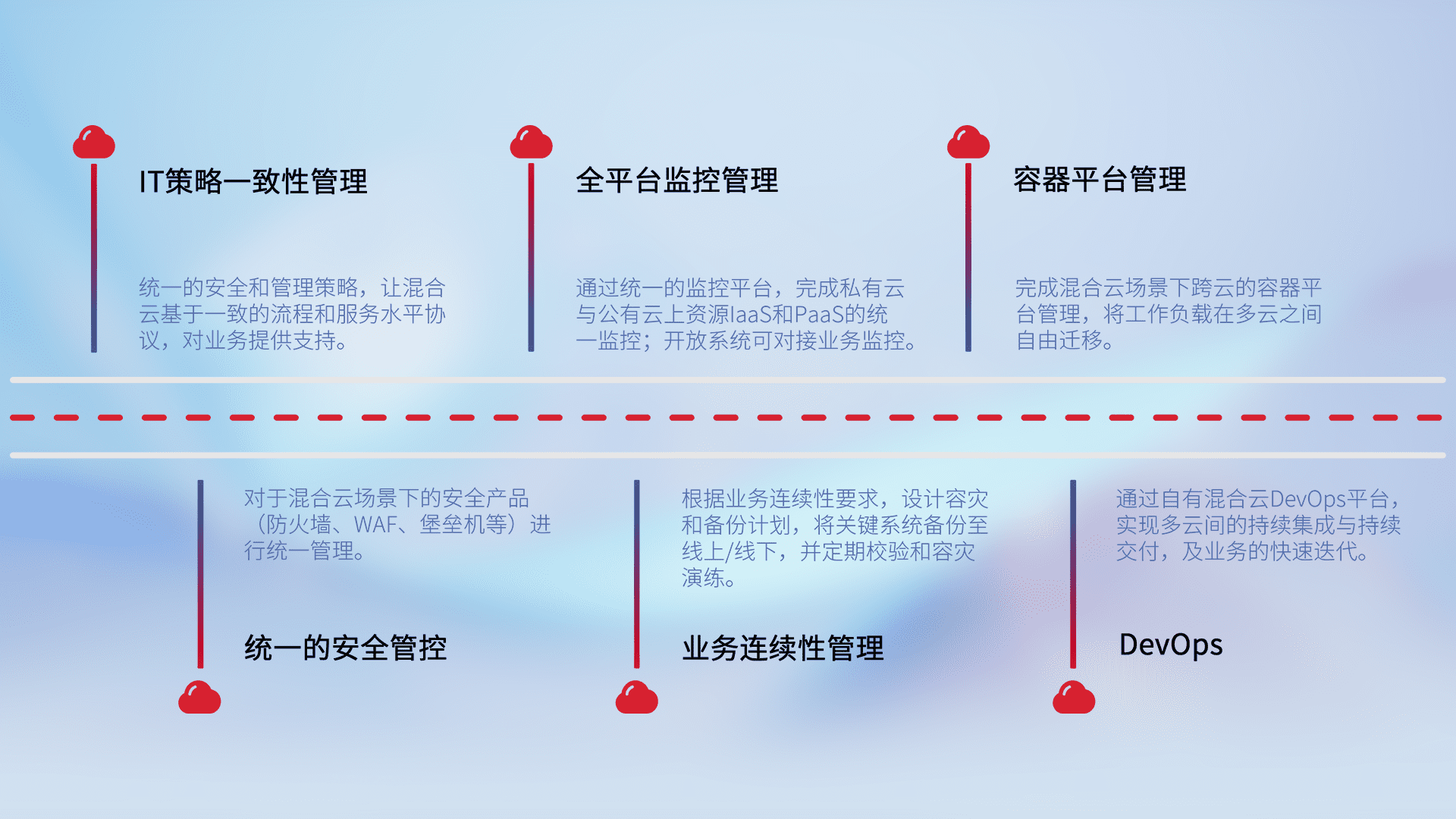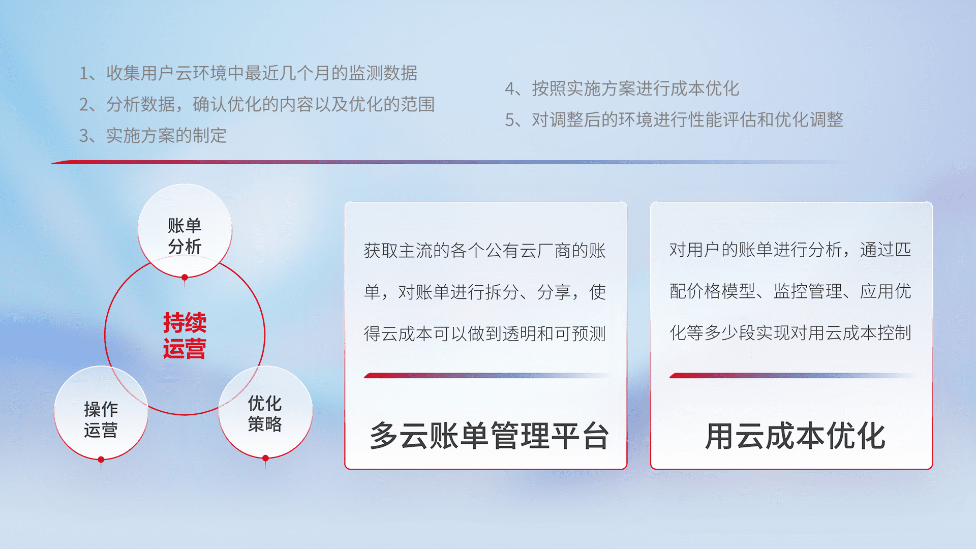 通过多云纳管,,以统一的资源数据模型把客户的云资源进行抽象和封装,,,,进而实现对多云资源的统一操作,,,,保障云资源管理的可靠性、、、稳定性与可用性。。量身定制化运维内容,,,配置、、开发运维、、补丁管理、、备份、、、、监控、、认证和访问管理、、、、审计和日常巡检等,,,保障在用云过程中的可靠度,,稳定度以及高可用率。。